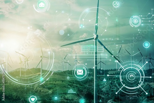 A futuristic interface of a social media platform dedicated to sharing innovations in green technology, set against a backdrop of wind turbines