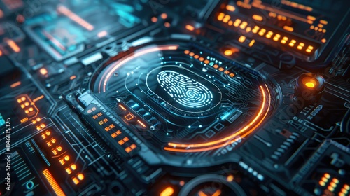 A futuristic interface with a fingerprint scanner and digital padlock, highlighting cyber security measures for protecting personal information.