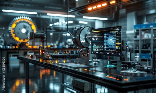 A futuristic laboratory featuring advanced technology, computer screens, and intricate machinery in a sleek, modern environment.