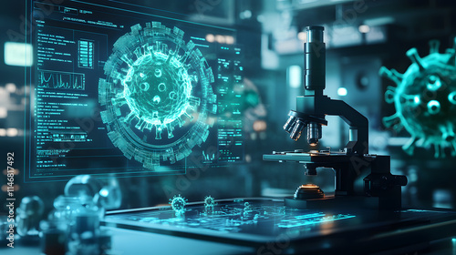A futuristic laboratory scene featuring a microscope, a glowing digital screen displaying a virus model, and advanced scientific tools. This high-tech image represents research, microbiology,