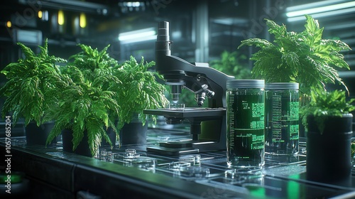 A futuristic laboratory setting with a microscope, plants, and beakers.