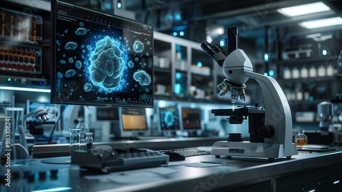 A futuristic laboratory with a microscope and a computer screen displaying a digital brain with glowing cells.