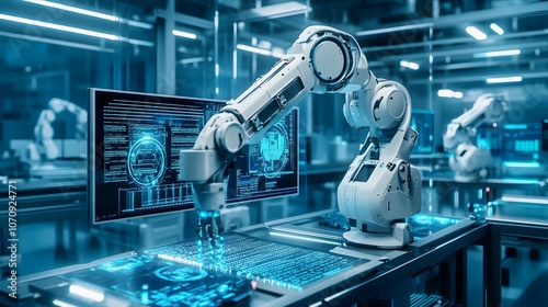 A futuristic laboratory with advanced robotic arms and holographic displays, showcasing the power of AI technology in industrial design and product development