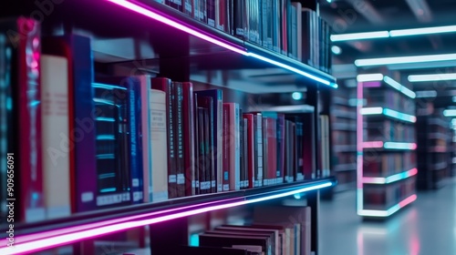 A futuristic library filled with shelves of books illuminated by vibrant neon pink and blue lights, creating an engaging and modern space for readers.