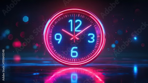 A futuristic light effect of a digital clock. An illustration of a neon neon clock with a blue background.