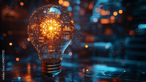 A futuristic lightbulb, illuminated with data and technology, representing innovation.