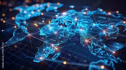 A futuristic map showcasing digital connections across continents with glowing networks and nodes, representing global communication.