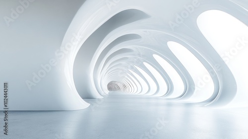 A futuristic, minimalist interior with smooth white curves and a bright, open atmosphere.