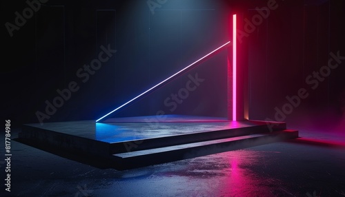 A futuristic neon-lit podium set against a dark background, creating a high-tech stage for showcasing products in a modern, innovative setting