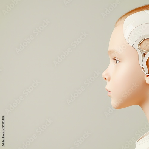 A futuristic portrait of a child with a robotic element integrated into their head, symbolizing the blend of technology and humanity.