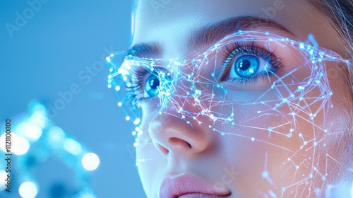 A futuristic portrait of a woman with digital facial enhancements, featuring glowing connections and vibrant blue tones, symbolizing technology and innovation.