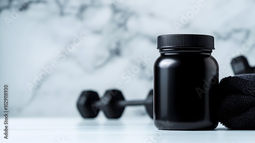 A futuristic protein powder jar featuring sleek metallic textures and bold modern typography, gym setting with dumbbells and towels, photorealistic, isolated on white background