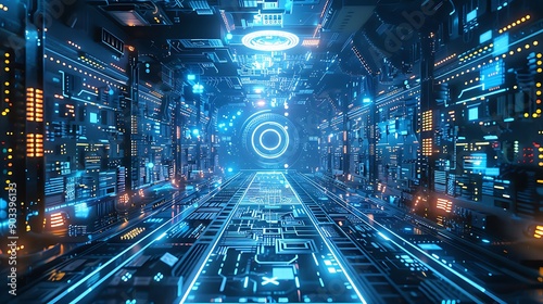 A futuristic quantum computer with intricate circuits and glowing data streams, housed in a sleek, high-tech lab with ambient blue lighting and advanced equipment.