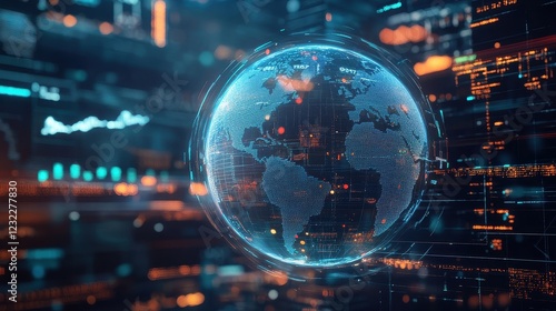 A futuristic representation of global connections, a globe surrounded by spinning holographic data points, sci-fi, high resolution, vibrant tones