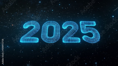 A futuristic representation of the year 2025 displayed in a glowing wireframe style against a cosmic background.