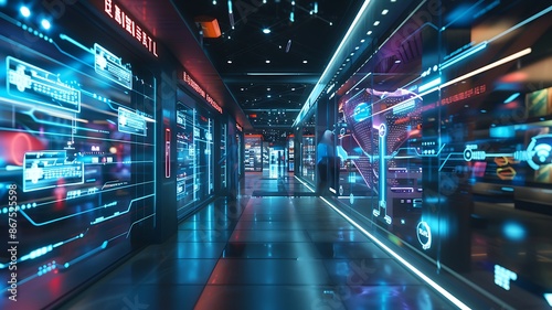 A futuristic retail environment with integrated digital screens and smart technology, illustrating the concept of omnichannel retailing