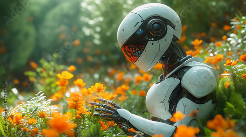 A futuristic robot carefully watering a garden of vibrant flowers, surrounded by lush greenery, gentle sunlight, nature-loving AI