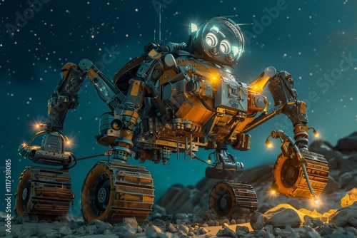 A futuristic robot exploring a distant planet under a starry sky.