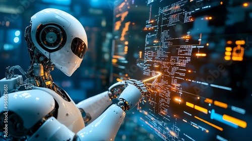 A futuristic robot interacts with digital data, showcasing advanced technology and innovation in artificial intelligence.