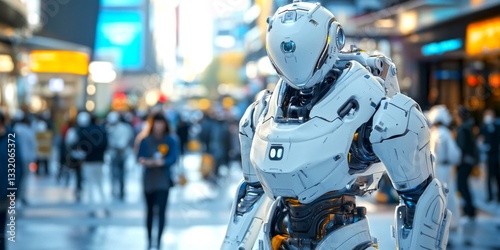A futuristic robot stands in a bustling city. The design is sleek and modern, making it an eye-catching focal point. This image captures technology in urban life. AI
