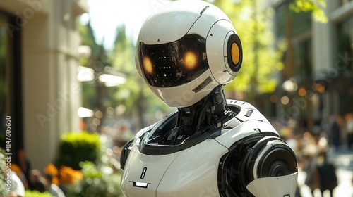 A futuristic robot with a sleek design stands in an urban environment, showcasing advanced technology and innovation.