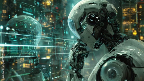 A futuristic robot with glowing circuits against a cityscape backdrop.