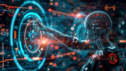 A futuristic scene depicting an individual donning a luminescent cyber-suit, seamlessly interacting with a holographic interface