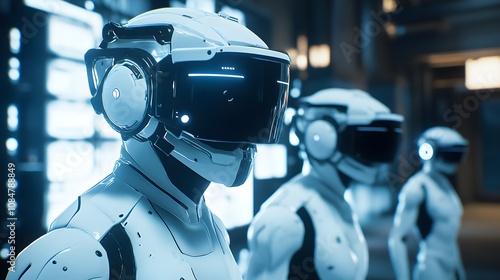 A futuristic scene featuring humanoid robots with sleek designs, set against a backdrop of illuminated technology.