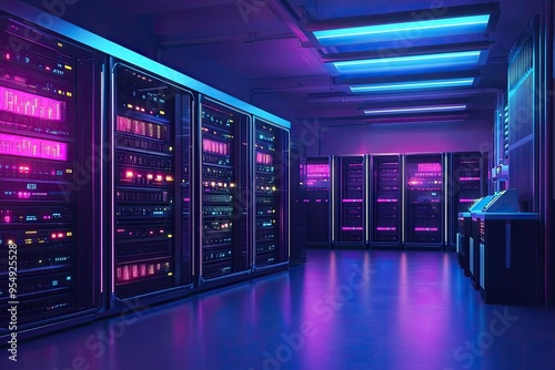 A futuristic server room with blue and pink lights. This image can be used for websites, articles, and social media posts about technology, data storage, and the future of computing.