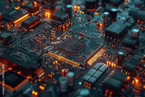 A futuristic setup displays a computer systems processor and microchip, surrounded by intricate electronic circuits that symbolize the forefront of technological innovation