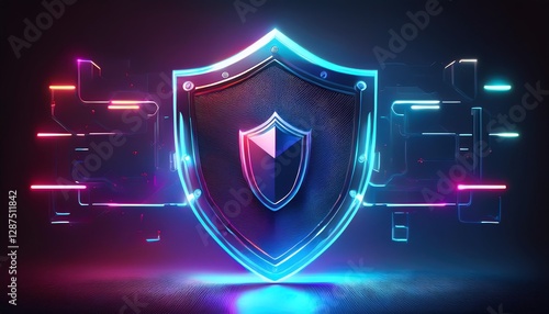 A futuristic shield design illuminated with neon lights, symbolizing protection and security in a digital environment.