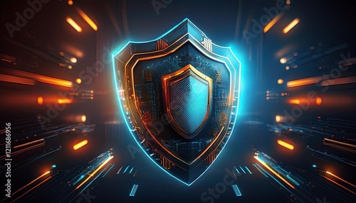 A futuristic shield glows with blue and orange lights, symbolizing protection and cybersecurity in a digital landscape.