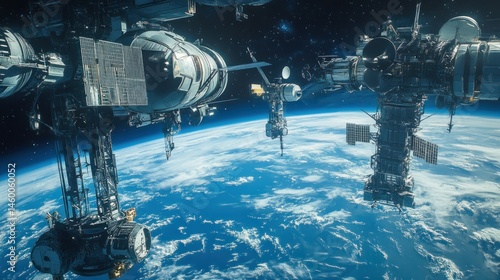 A futuristic space station orbiting the Earth, with many antennas, satellite dishes, background wallpaper AI generated image