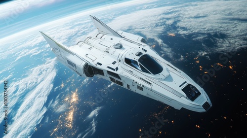 A futuristic spacecraft gliding through space above Earth, showcasing advanced technology.