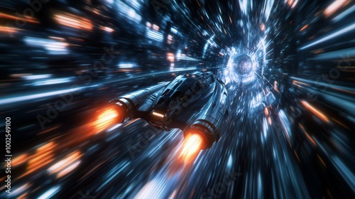 A futuristic spacecraft travels through a colorful wormhole, enhancing the imagination of interstellar travel during deep space exploration