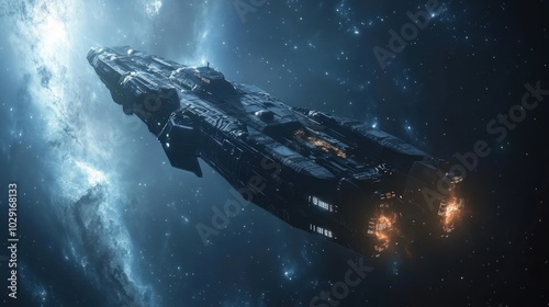 A futuristic spaceship, dark and sleek, with glowing lights, traversing a starry void
