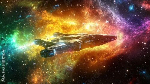 A futuristic spaceship gliding through a vibrant cosmic nebula filled with colors.