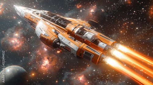 A futuristic spaceship journeys through a vast interstellar galaxy expanse