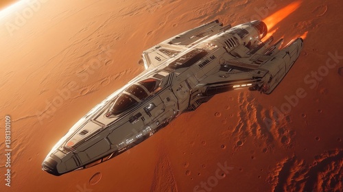 A futuristic spaceship soaring through the atmosphere of an alien planet