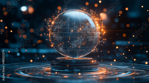 A futuristic sphere made of glass and metal, floating in the center surrounded by holographic images representing a global network. The style is cyberpunk, with dark blue tones, digital illustration,