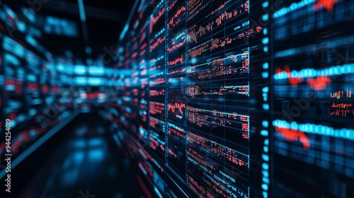 A futuristic stock market trading floor filled with digital screens displaying real-time stock prices, traders using holographic interfaces to analyze financial data, 3D illustration