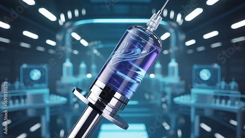 A futuristic syringe filled with a swirling liquid, set against a high-tech backdrop.
