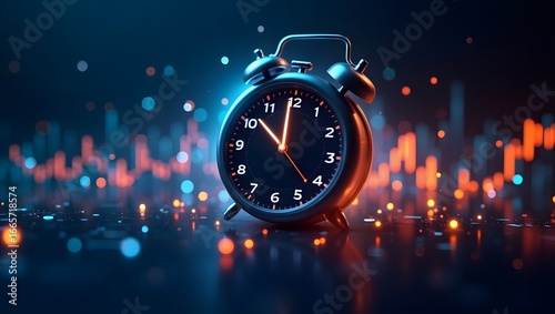 A futuristic time trading concept with a digital clock counting down, surrounded by floating stock market symbols, glowing numbers, and graphs, emphasizing time as a valuable asset in trading.