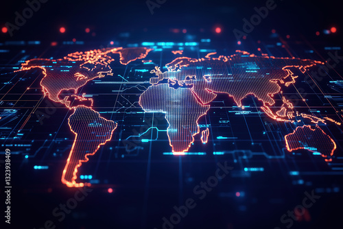 A futuristic topographic world map, featuring neon-glowing contour lines. The background is dark.