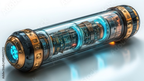 A futuristic, transparent tube with complex internal mechanisms and glowing lights.
