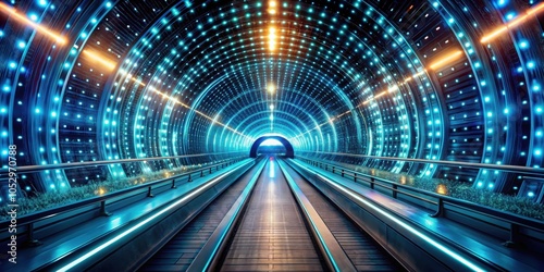 A futuristic tunnel illuminated by a dazzling array of blue and orange lights, with a moving walkway leading towards an unknown destination.