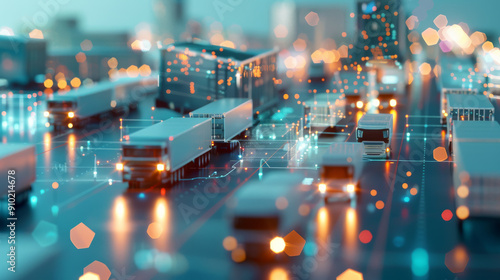 A futuristic view of transportation logistics with cargo vehicles moving through a digitally enhanced landscape, highlighting the intersection of technology and commerce.