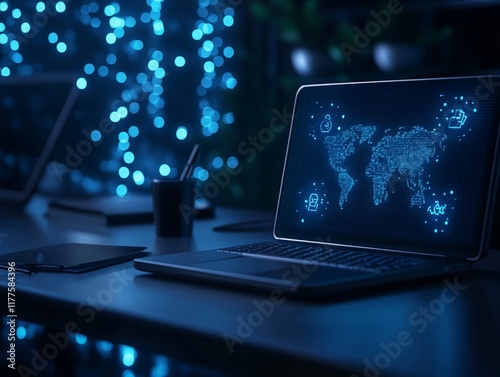 A futuristic workspace featuring laptop displaying glowing world map, surrounded by blue lights, creating tech savvy atmosphere