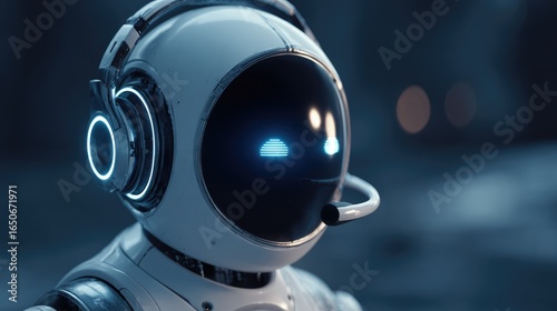 a futuristic-looking robot with a headset and illuminated features, set against a soft backdrop. The robot's design emphasizes technology and innovation