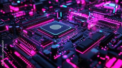 A G chip resting on a futuristic motherboard with neon lights.